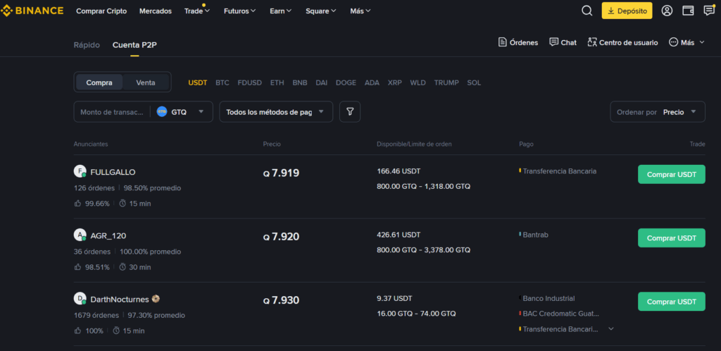 Permite la compra/venta de USDT con comerciantes locales en quetzales, actuando como intermediario para mayor seguridad.