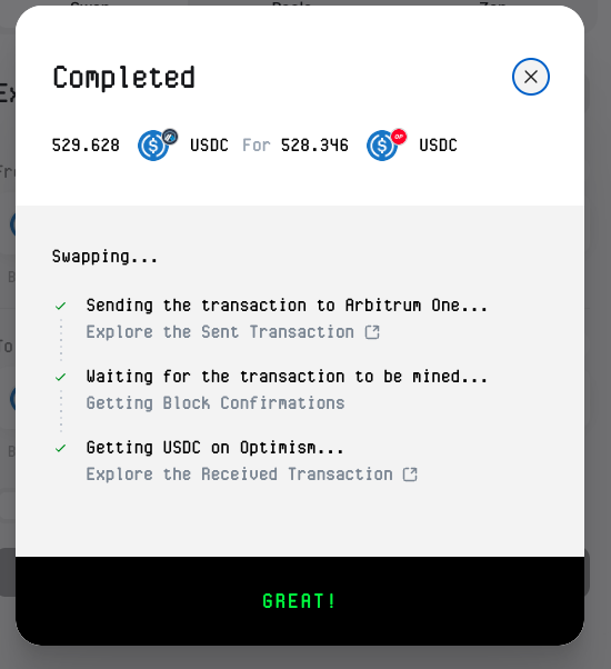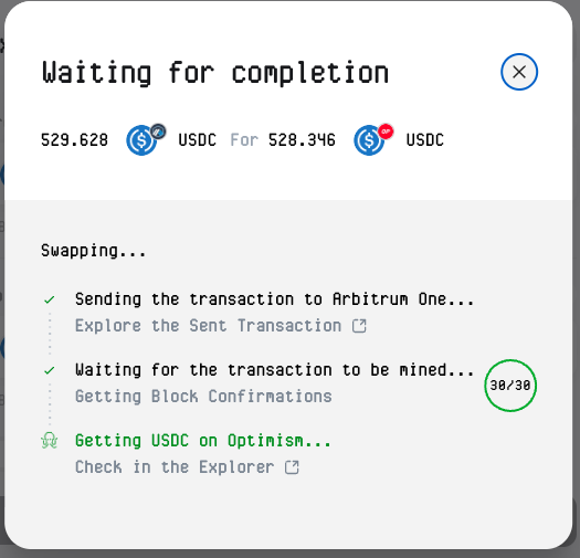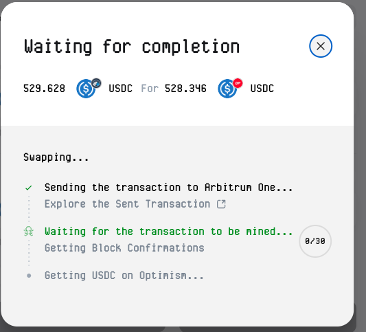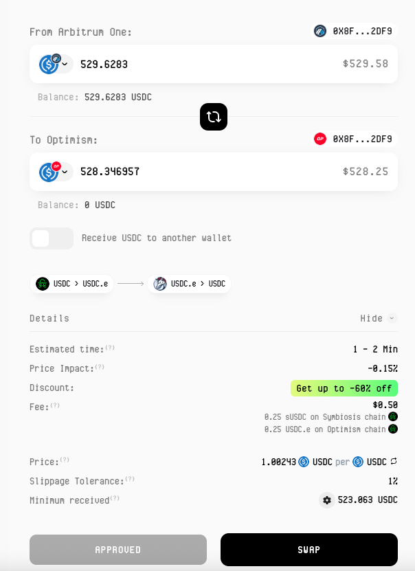 Elegí swapping USDC de Arbitrum a USDC de Optimisim. El proceso fue el inicio de la acción: ingresé la cantidad, vi el quote en tiempo real (incluyendo fees estimados, que eran razonables y hasta dan -60% de descuento, y confirmé. Symbiosis maneja todo en una sola tx gracias a su aggregating de liquidity. No tuve que lidiar con múltiples aprobaciones o wallets separadas. A nivel emocional, fue liberador, de sentirme abrumado por la fragmentación de blockchains y lo tardado que era hacer swaps entre block chains, a sentirme aliviado al ver que los tokens llegan rápido y sin problemas.